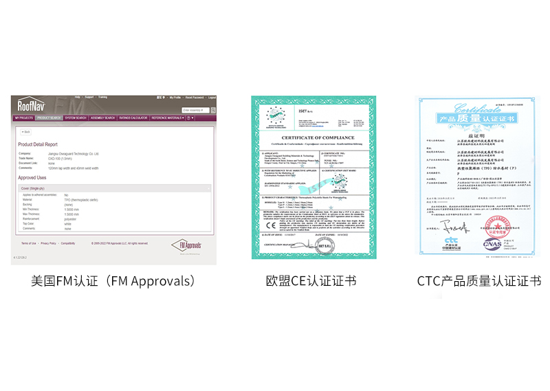 歐西盾TPO產(chǎn)品先后通過(guò)了高新技術(shù)產(chǎn)品認(rèn)定、歐盟CE認(rèn)證、中國(guó)建材CTC產(chǎn)品質(zhì)量認(rèn)證以及美國(guó)FM認(rèn)證。FM認(rèn)證在全球范圍內(nèi)被普遍承認(rèn),通過(guò)FM認(rèn)證就意味著該產(chǎn)品已經(jīng)通過(guò)了國(guó)際高標(biāo)準(zhǔn)的檢測(cè)。FM認(rèn)證對(duì)TPO產(chǎn)品的抗風(fēng)揭、阻燃、抗紫外線、抗踩踏、抗冰雹等一系列應(yīng)用性能都有著嚴(yán)苛的要求。