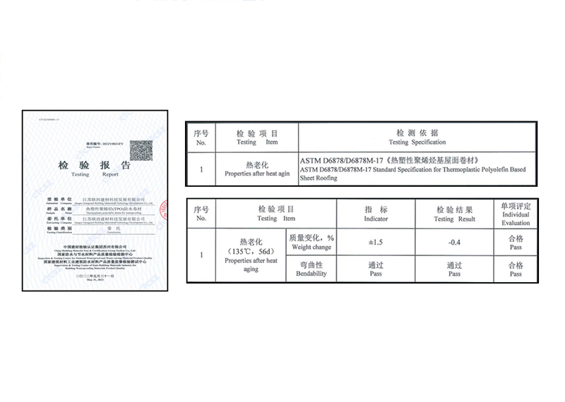 歐西TPO產(chǎn)品具有優(yōu)異的熱老化性能。根據(jù)美國(guó)材料與試驗(yàn)協(xié)會(huì)(American Society for Testing and Materials)相關(guān)研究并結(jié)合大量工程調(diào)查發(fā)現(xiàn),TPO卷材的失效很多都是由于高溫導(dǎo)致,熱老化后卷材表層的TPO涂層一旦開裂不能保持水密性,將導(dǎo)致熱防水層的失效,所以熱老化性能對(duì)TPO卷材耐久性有著至關(guān)重要的影響。歐西TPO產(chǎn)品熱老化性能已通過(guò)了嚴(yán)苛的美標(biāo)ASTM D6878相關(guān)檢測(cè)。美標(biāo)中TPO卷材的熱老化測(cè)試條件要求135℃,56天,遠(yuǎn)超國(guó)家標(biāo)準(zhǔn)要求的115℃,28天要求。