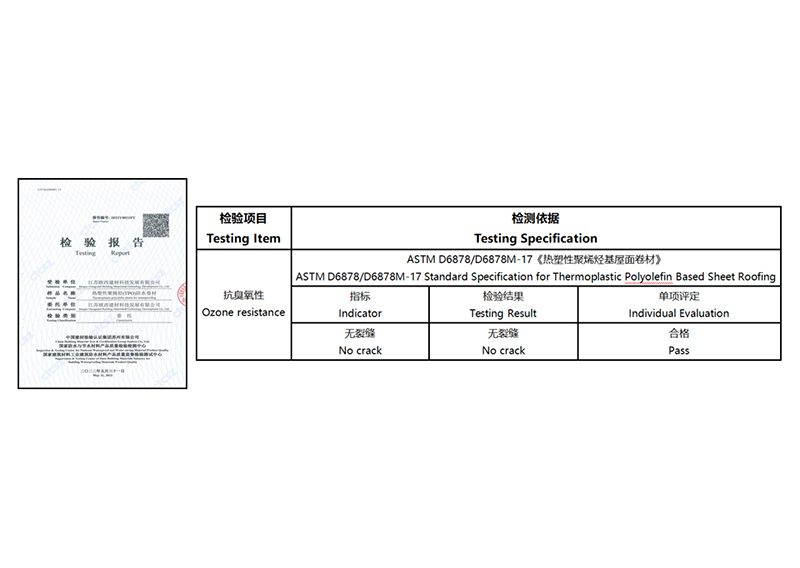 歐西TPO產(chǎn)品具有優(yōu)異的抗臭氧性能,能夠更長(zhǎng)久的抵御臭氧的氧化,保證材料的耐久性能。對(duì)于環(huán)境中臭氧含量高的地區(qū),無(wú)論是材料的環(huán)保性能亦或是使用壽命來(lái)說(shuō)歐西TPO產(chǎn)品都是最優(yōu)選擇,目前公司產(chǎn)品已通過(guò)了美標(biāo)ASTM D6878標(biāo)準(zhǔn)中抗臭氧性的相關(guān)檢測(cè)。
