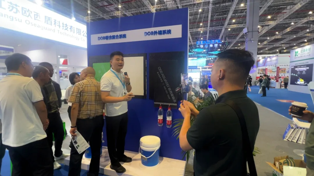 行業著名的大隱于水先生蒞臨歐西盾防水展位。市場總監丁彥臻對公司的金屬屋面防水系統及新型產品DOB快粘持粘涂料進行講解,現場氛圍極其熱烈,分享內容極具含金量。