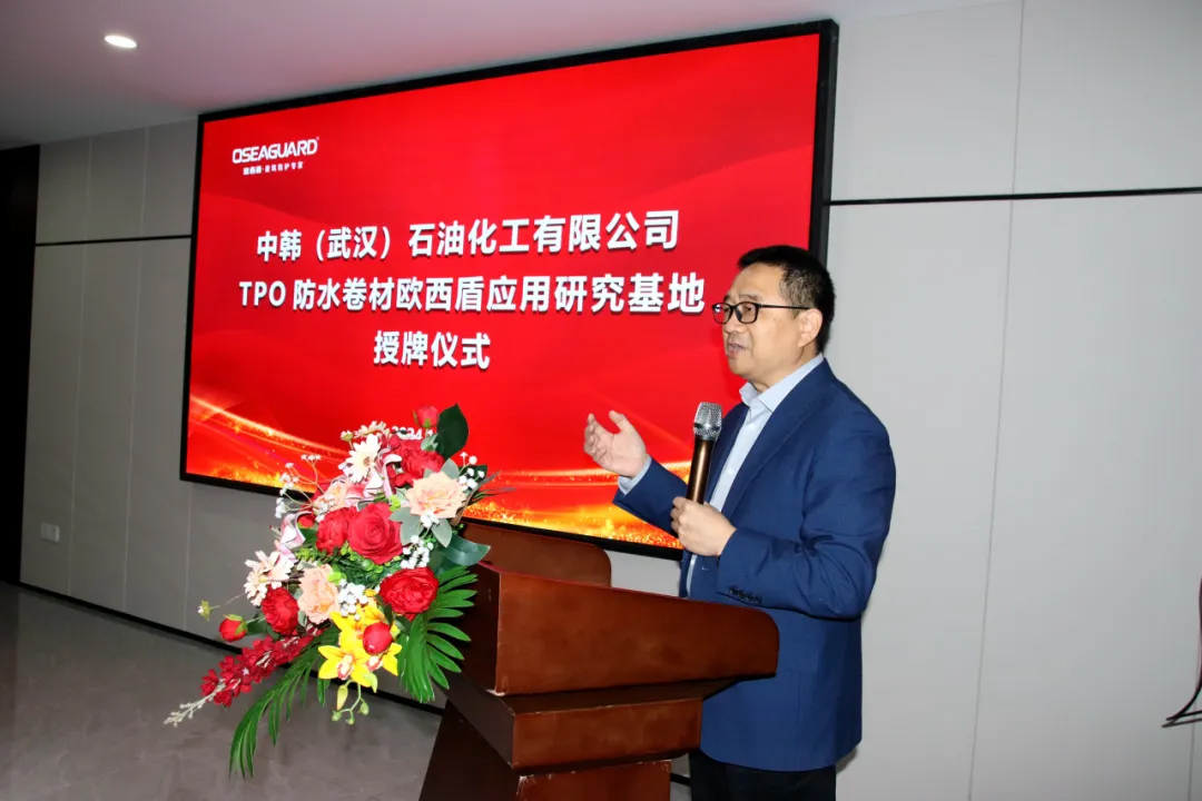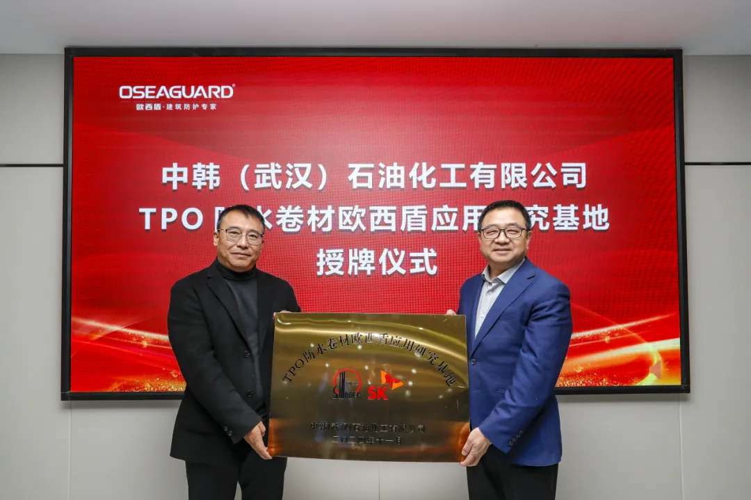 中韓(武漢)石油化工有限公司黨委書記、董事長、總經理劉百強為歐西盾TPO防水卷材應用研發(fā)基地授牌,至此,雙方合作邁入嶄新階段,將共同致力于推動中韓石化超軟聚丙烯在TPO防水卷材領域的技術革新與應用拓展。