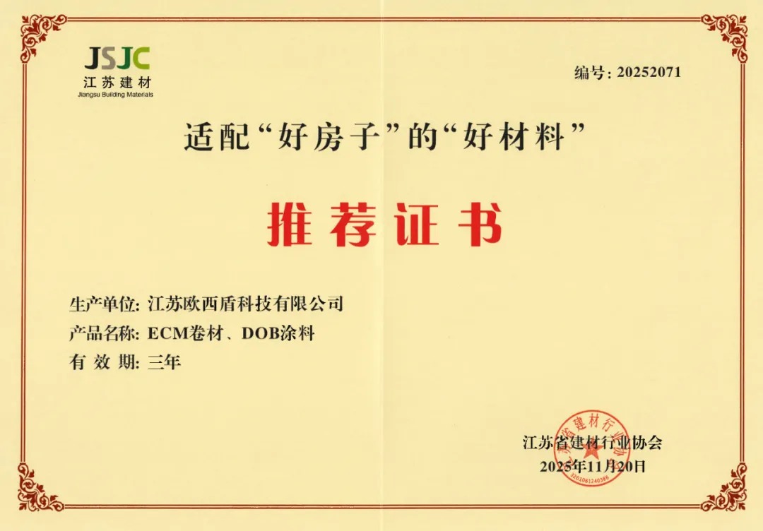 近日,經江蘇省建材行業協會嚴格評審,歐西盾防水旗下ECM高分子防水卷材、DOB防水涂料兩大核心產品,憑借卓越的產品性能及出色的環保品質,成功入選適配“好房子”的“好材料”名錄,斬獲權威推薦證書。這一榮譽不僅是對歐西盾防水產品價值的高度認可,更彰顯了其在“守護好房子”道路上的堅實擔當,為建筑防水行業樹立了品質標桿。