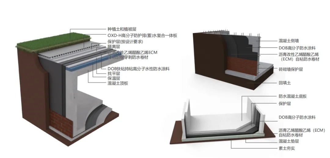 OXD復合防水系統是我司推出的新型卷涂復合防水系統,采用了我司自主研發的瀝青乙烯醋酸乙烯(ECM)防水卷材與DOB快粘持粘防水涂料進行結合,先采用噴涂工藝噴涂DOB快粘持粘防水涂料后,再采用自粘法施工將瀝青乙烯醋酸乙烯(ECM)防水卷材鋪貼在防水涂料上,采用熱風焊接法搭接的新型卷涂復合防水系統。