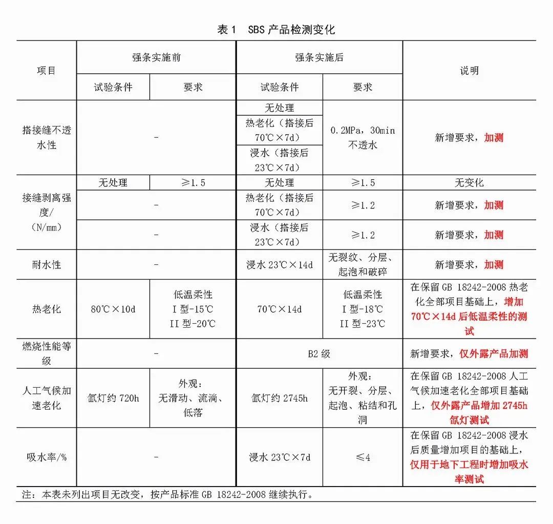 自粘聚合物改性瀝青防水卷材(執行標準為GB 23441—2009《自粘聚合物改性瀝青防水卷材》),改性瀝青聚乙烯胎防水卷材(執行標準為GB 18967—2009《改性瀝青聚乙烯胎防水卷材》)。自粘聚合物改性瀝青防水卷材和改性瀝青聚乙烯胎防水卷材均屬于瀝青類防水卷材,這兩類產品不適合外露使用,因此不涉及強條規定外露使用的相關要求。