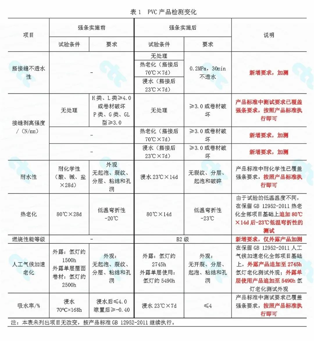 預鋪防水卷材(執行標準為GB/T 23457—2017《預鋪防水卷材》)。預鋪防水卷材施工完成后,在混凝土澆注前,會有一段暴露時間,因此產品標準規定了“與后澆混凝土剝離強度(紫外線處理)”,采用的也是氙弧燈老化試驗方法,但這與強條提出外露防水材料人工氣候加速老化試驗并無關聯。本質上,預鋪防水材料還是非外露材料,不涉及強條規定外露使用的相關要求。
