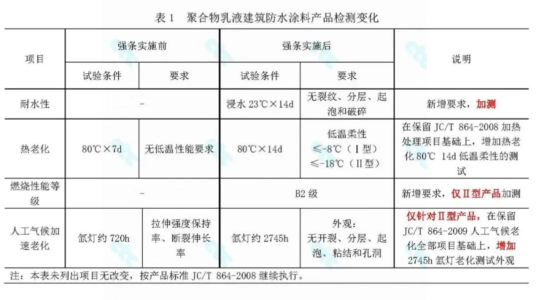 GB/T 23445—2009《聚合物水泥防水涂料》規定了“粘結強度(浸水處理)”的要求,但與強條提出的“與基層粘結強度浸水后保持率”項目并不能等同使用。要求上產品標準規定了限值,強條要求保持率;試驗方法上也不一致。強條的該項要求目前尚沒有明確的試驗方法。國檢集團蘇州公司在制定中國建筑防水協會團體標準《高耐水性聚合物水泥防水涂料》時已開展過大量基礎研究。
